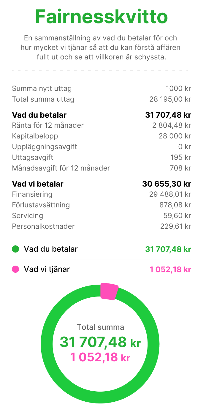 Finansnissar kallar det “unit economics” vilket på ren svenska betyder “detaljer kring affären vi nu gör”. Vad du betalar, vilka kostnader vi har och vilken vinst vi står att göra. På så sätt får du full inblick i dealen du gör med oss. För att i slutänden handlar fair krediter om att hjälpa dig ta välgrundade beslut.